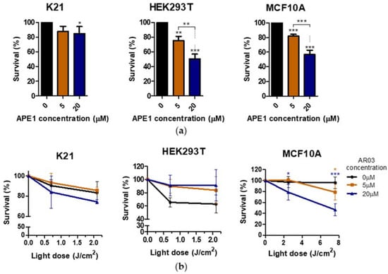 The effect of APE1 inhibition on non-cancer cell lines. (a) AR03 effect on K21, HEK293T, and MCF10A cells. (b) Influence of APE1 inhibitor combined with PDT treatment on K21, HEK293T, and MCF10A cells. Statistical significance was calculated by one-way or two-way ANOVA followed by Bonferroni test (* p ≤ 0.05, ** p ≤ 0.01, *** p ≤ 0.001).