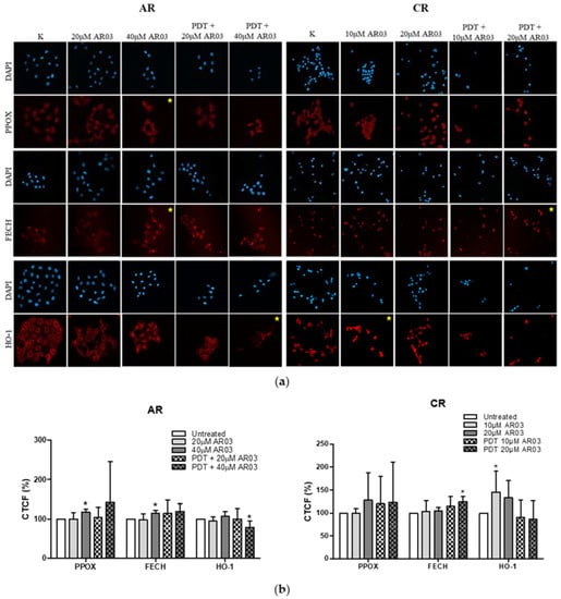 Effect of AR03 on PPOX, FECH, and HO-1 levels. (a) Images of stained cells before treatment, after AR03 treatment, or after PDT combined with AR03 treatment. (b) Graphs with percentage values CTCF of untreated cells, resistant to PDT. Asterisks indicate the statistical significance of the differences between cells after treatment and untreated control calculated by the Mann–Whitney test (* p ≤ 0.05).
