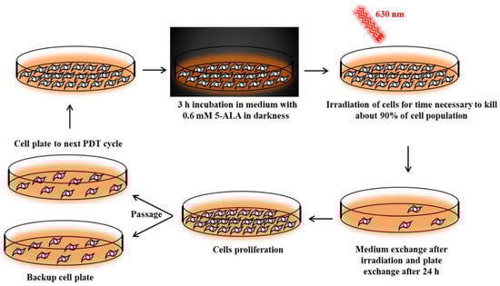 Cancer cell lines sensitive to PDT were subjected to repetitive cycles of PDT (Figure S1a,b, Supplementary Materials) according to Casas et al []. Cells were incubated for 3 h in serum-free medium with 0.6 mM ALA (Sigma-Aldrich). This incubation time was long enough to uptake 5-ALA and synthesize PpIX by cells []. Then, cells were exposed to red light (630 nm wavelength, 187 W/m2 power density) emitted by an LED lamp with a dose appropriate to kill about 90% of the cells (Figure 10). Surviving cells were cultured in growth medium until they reached 90% confluence and then were subjected to the next PDT treatment. This allowed for the isolation of PDT-resistant cells. The A-431 resistant cell line was isolated after 10 cycles of PDT, and the CAL-39 resistant cell line after 7 cycles.