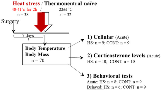 Figure 1. Study design–Experiment 1: The effect of heat-stress on physiological, cellular and behavioral responses. After a habituation period of seven days, animals were subjected to heat stress (HS) (40 ± 1 °C, 2 h). Control (thermoneutral, TN) animals were kept at room temperature (22 ± 1 °C) for the same period. Body mass and rectal temperature (Tre) were measured at baseline and every hour of the protocol. Core temperature was measured using telemetry throughout the entire protocol. After completion of the protocol, animals were sacrificed and their brains were collected for immunohistochemical analysis of chosen cellular markers. Trunk blood was used for circulating corticosterone measurement (corticosterone measurement). In a cohort of the animals, behavioral assessments were performed either immediately (acute response) or seven days after the HS exposure (delayed response) (Behavioral tests).
