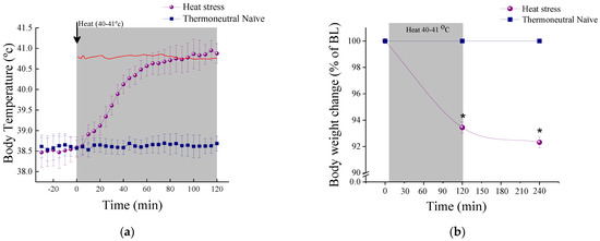 Figure 2. Physiological response to heat stress. (a) The dynamic change of core body temperature (Tb) over time during HS. (b) The change in body mass (BM) as percent change from baseline over time during HS. The red line represents the temperature inside the chamber along the experiment. Results displayed as mean ± S.E.M. * < 0.001.