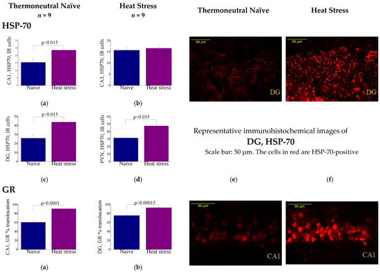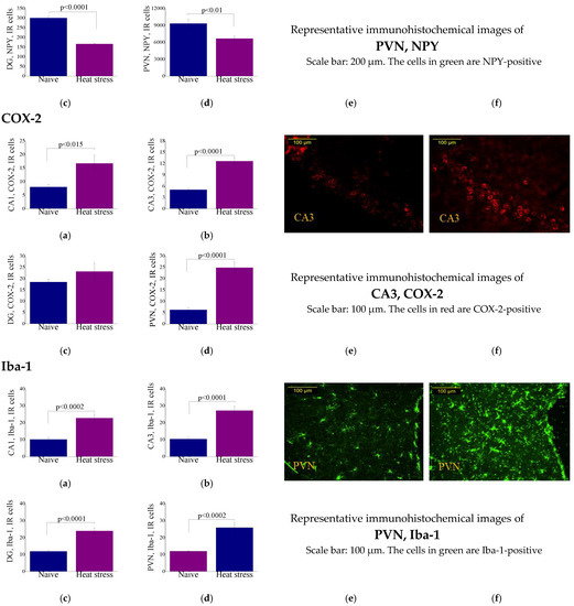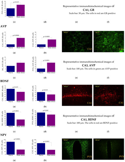 Immunohistochemistry results of cellular markers under basal conditions (thermoneutral naive (TN)) and after heat stress (HS) are displayed in Figure 3. Immunoreactive (ir) cell numbers of HSP-70, GR, AVP, BDNF, NPY, COX-2 and Iba-1 positive cells within the Cornu Ammonis (CA) 1 and 3 and the DG of the hippocampus and the hypothalamic PVN were compared between the groups. Representative immunohistochemical images of each gene are displayed in Figure 3e,f.