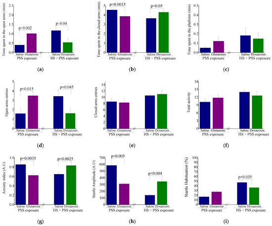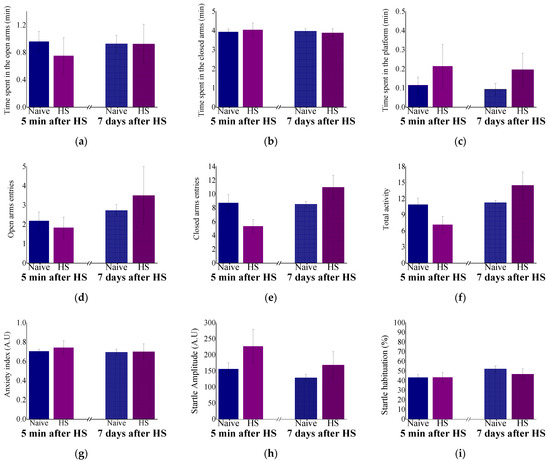 Acute and delayed behavioral responses are depicted in Figure 4. No significant differences were noted in any of the elevated plus maze (Figure 4a–g) and the acoustic startle response (Figure 4h,i) parameters between the groups.