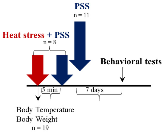 Figure 5. Study design–Experiment 2: The effect of HS-preconditioning on resiliency to psychological stress. After a habituation period of seven days, animals were subjected to HS and immediately were exposed to psychological stress, the predator-scent stress (PSS) (HS + PSS). Control animals were exposed to PSS only. Body mass and body temperature were measured at baseline, at every hour of the protocol and after 2 h at a room temperature (22 ± 1 °C). Behavior was assessed on day seven to examine the delayed behavioral response of HS-preconditioning to PSS.