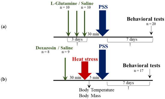 Figure 7. Study design–Experiment 3: The role of heat-shock protein (HSP)-70 in modulating the protective behavioral response to predator-scent stress (PSS). (a) L-glutamine: Animals were fed with the amino acid L-glutamine (0.375 g/kg) or vehicle via gavage for three days. On day three, animals were exposed to PSS and behavior was assessed on day seven. (b) Doxazosin: animals were injected with the α1-adrenoceptor antagonist Doxazosin (1.5 mg/kg i.p) or saline. Thirty minutes after the injection, animals were exposed to the HS and immediately after to the PSS. Body temperature and body mass were measured at baseline and every hour of the protocol. Behavior was assessed on day seven.