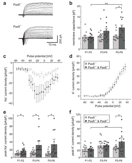 2.2. Na+ Current Densities in Hippocampal Neurons from Pax8−/− Mice