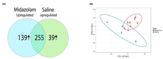 Overall data differentiation between control and MDZ-exposure samples: (A) Venn diagram showing total differentially expressed proteins found in between samples; the ↑ symbol represents the upregulation of DEPs with respect to saline or MDZ group. (B) principal component analysis (PCA) between the saline and midazolam-exposed samples from all six biological replicates from each group.