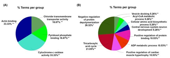 Mapping of molecular functions (A) and biological processes (B) using ClueGO. The asterisks represent the group term p-value representing each category. * p < 0.05 and ** p < 0.01.