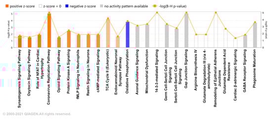 Proteins were identified as differentially expressed if the t-test p-value was ≤0.05, and absolute fold change was ≥1.5. In each comparison, heatmaps of all differentially expressed proteins were plotted using the function heatmap.2 in the R (version 3.6.0) package, gplots. Gene Ontology (GO) analysis of differentially expressed proteins was performed using the Cytoscape plug-in ClueGO []. Biological processes and molecular functions were included for GO enrichment analysis. Canonical pathway analysis was performed using the Ingenuity Pathway Analysis (IPA) software (Ingenuity® Systems, Redwood City, CA, USA, www.ingenuity.com, accessed on 8 November 2021) by comparing the differentially expressed proteins against known canonical pathways (signaling and metabolic) within the IPA database. Enriched pathways with Benjamini–Hochberg false discovery rate (FDR) p-value ≤ 0.05 were considered for further analysis.