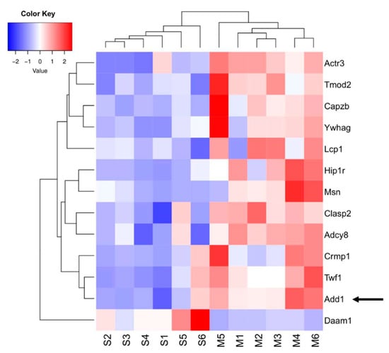 Heatmap visualization of differentially regulated proteins associated with actin-binding and negative regulation of protein depolymerization from ClueGO analysis features measured in the saline and midazolam-exposed samples from all six biological replicates from each group. The arrow highlights alpha-adducin (protein selected for post validation).