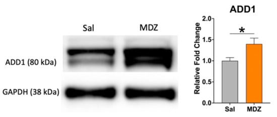 Validation of ADD1 upregulation after MDZ exposure. A representative Western blot is depicted here. GAPDH was used as an internal control. Data are represented as Mean ± SEM (n = 15/group) and significance was determined with an unpaired t-test after Welch’s correction. * p < 0.05.