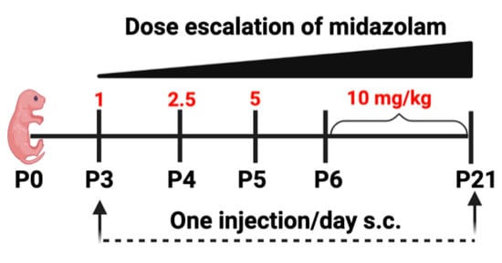 Starting at postnatal day 3 (P3), pups are given a single subcutaneous (s.c.) injection of 1 mg/kg midazolam (mixed with sterilized saline and administered at a uniform volume of 100 µL/10 g of birth weight of pup) and ramped up using a dose-escalation method until day 21 to closely mimic increments as performed in a NICU (Figure 6). Due to faster drug metabolism in rodents than in humans, a higher relative dose is required to induce an equivalent of 60 min sedation, which is similar to the NICU setting [] This dosage was adapted based on previously published studies [,,,,]. Immediately after injection, pups are monitored for any distresses, including placing them under a heating lamp to prevent thermal loss.