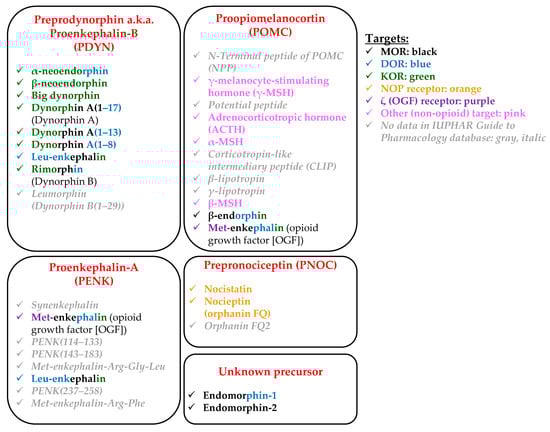 Overview of the origin and receptor affinity of the most important endogenous opioids. The color code indicates the relevant targets of each molecule. When one molecule can activate more than one receptor, the order of the colors from the left to the right represents the order of the affinity toward each receptor. For example, the order of colors in case of “β-endorphin” (black-blue-green) indicates that its affinity is the highest to human MOR, it is less to DOR, and even less to KOR. Affinity data are obtained from the IUPHAR Guide to Pharmacology database (accessed on 5 December 2021) and from Ref []. Importantly, lack of a specific color does not necessarily mean lack of the respective binding, but rather lack of experimental evidence of the said binding. Please note that we only provide affinity but not efficacy data of the substances.