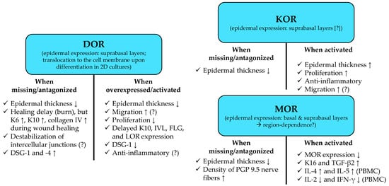 Moreover, the epidermis of DOR−/− C57BL/6 mice was found to be thinner as compared to the wild-type littermates []. Furthermore, the expression of the early differentiation marker K10 [], as well as levels of K6 (a marker of hyperproliferative keratinocytes [,]), and collagen IV were increased in the course of wound healing in a burn wound model of DOR−/− mice. Importantly, in the meantime, the healing process itself appeared to be delayed (a ca. 2-day delay was observed) [], suggesting that the lack of homeostatic DOR signaling may lead to the initiation of a premature/disturbed differentiation process. Interestingly, DOR overexpression was found to inhibit the proliferation of human keratinocytes, resulting in decreased epidermal thickness in an organotypic human skin equivalent (made of N/TERT-1 cells seeded on rat tail collagen type I and human dermal fibroblasts) []. On the other hand, however, it also delayed the upregulation of K10 during in vitro differentiation and decreased its upregulation in the said 3D skin model []. This was accompanied by deregulation of involucrin (IVL), loricrin (LOR), and FLG, most likely in an extracellular signal-regulated protein kinase (ERK)-1/2 mitogen-activated protein kinase (MAPK) and POU2F3 (“POU Class 2 Homeobox 3”; a transcription factor involved in the regulation of the epidermal proliferation/differentiation balance []) dependent manner []. Based on these data, K10 expression appears to be tightly regulated by DOR; lack of homeostatic DOR signaling upregulates, while activation of DOR decreases K10 expression [,].
