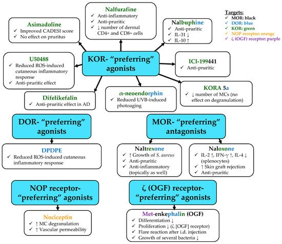 Importantly, depending on the targeted receptors and certain other factors, opioids can exert both pro- and antipruritic effects. Indeed, the activation of MOR increases, whereas KOR agonism usually (but not always; see below) alleviates itch, introducing KOR agonists (e.g., nalfurafine []) as well as certain antagonists that primarily target MOR (e.g., naltrexone []) as promising, novel antipruritic agents [,,,,,,,,].