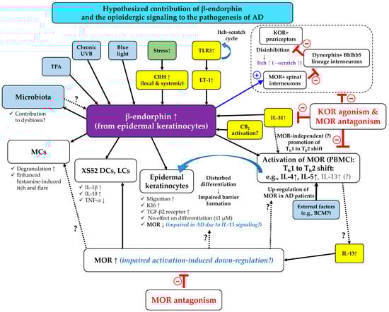 Importantly, although certain pieces of evidence argue that β-endorphin may context dependently promote immune responses, many findings support the concept that it usually dampens them (for details, see Ref []), while other data show that it exerts a complex immunomodulatory effect. For example, β-endorphin (10 nM) increased the LPS (1 µg/mL)-induced secretion of both IL-1β (pro-inflammatory cytokine) and IL-10 (anti-inflammatory cytokine) but suppressed the release of tumor necrosis factor (TNF)-α (pro-inflammatory cytokine) in the course of 24 h treatments on XS52 dendritic cells (a murine model of human Langerhans cells (LCs) originated from the epidermis of newborn BALB/c mice) []. Similar effects were seen at the mRNA level on freshly isolated murine LCs as well []. Thus, the biological effects of the elevation of β-endorphin production in the above inflammatory conditions are most likely context dependent and may be influenced by other factors, e.g., alterations in the local expression pattern of its receptors. From this perspective, it seems to be important to emphasize that 24 h treatment with the highly AD-relevant [,] cytokine IL-13 (100 ng) upregulated MOR (the most important receptor of β-endorphin) in human monocyte-derived LCs that were activated by a 48 h treatment of the combination of 1 µg/mL LPS and poly-(I:C) (10 µg/50,000 cells) []. Moreover, MOR expression was detected in all epidermal layers, and its intensity was not significantly different between healthy individuals and AD patients. However, it was significantly reduced by PUVA (psoralen-ultraviolet A) therapy (0.6 mg/kg 8-methoxypsoralen p.o., 2–6 J/cm2) of the said patients []. Thus, although the effect of IL-13 on the MOR expression of the keratinocytes has not been investigated yet, based on the above findings [], one might speculate that IL-13-mediated pathological inflammatory response may prevent activation-induced downregulation of MOR [,] in lesional keratinocytes of AD patients, maintaining pathologically prolonged MOR activity.
