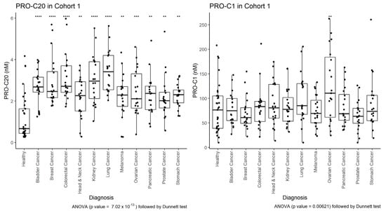 PRO-C20 (left) and PRO-C1 (right) in cohort 1. Quantification of PRO-C20 and PRO-C1 in serum from healthy controls (n = 33), bladder cancer (n = 20), breast cancer (n = 20), colorectal cancer (n = 20), head and neck cancer (n = 20), kidney cancer (n = 20), lung cancer (n = 20), melanoma (n = 20), ovarian cancer (n = 19), pancreatic cancer (n = 20), prostate cancer (n = 20), and stomach cancer (n = 20). Biomarker levels are presented as Tukey-style boxplots with data-point jitter. Samples measuring below the lower limit of measurement range were given the value of that limit, as determined in the validation of the assays. Differences in biomarker levels between cancer groups and the healthy controls were evaluated by ordinary ANOVA followed by multiple comparisons to the controls with Dunnett test. **** indicates a p-value below 0.0001. *** below 0.001. ** below 0.01.