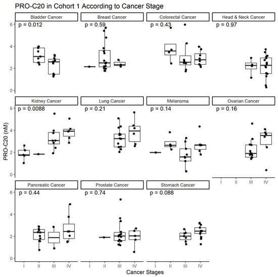 PRO-C20 in cohort 1 according to cancer stage. Quantification of PRO-C20 in cohort 1 was stratified into cancer types and plotted as a function of cancer stage. Biomarker levels are presented as Tukey-style boxplots with datapoint jitter. Differences in PRO-C20 according to cancer stage in each cancer type was evaluated by ordinary ANOVA.