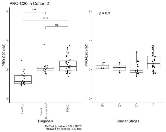 PRO-C20 in cohort 2. Left: Quantification of PRO-C20 in sera from healthy controls (n = 20), chronic pancreatitis (n = 11), and pancreatic ductal adenocarcinoma (PDAC, n = 36). PRO-C20 levels are presented as Tukey-style boxplots with data-point jitter. Differences in PRO-C20 levels between the groups were evaluated by ordinary ANOVA followed by multiple comparisons with Tukey’s HSD test. **** indicates a p-value below 0.0001. *** below 0.001. ns no significance. Right: Quantification of PRO-C20 in cohort 2 plotted as a function of cancer stage. Biomarker levels are presented as Tukey-style boxplots with datapoint jitter. Differences in PRO-C20 according to cancer stage were evaluated by ordinary ANOVA.