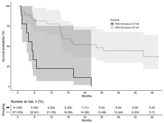 Kaplan–Meier curves of survival in patients with pancreatic ductal adenocarcinoma grouped into high (above 2.57 nM) or low PRO-C20 (below 2.57 nM) shaded with 95% confidence intervals.