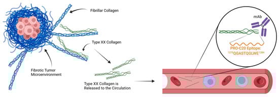 The tumor microenvironment accumulates collagens and forms fibrosis. The primary components of tumor fibrosis are fibrillar collagens, such as type I or type III collagen, and FACIT collagens, such as type XX collagen, are thought to organize the fibrillar collagens. Fragments of type XX collagen find their way to the circulation, where they can be detected in blood samples by a monoclonal antibody (mAb) raised against the C-terminus of type XX collagen and quantified in an ELISA. Figure made with BioRender.