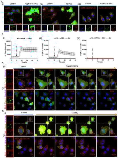 Activation of TRPV4 triggers exocytosis via agonist stimuli. (A) Representative scanning disk confocal images of agonists with (i) GSK1016790A (20 nM) or (ii) 4α-PDD (5 μM) stimuli to A375 cells and (iii) A375 cells with TRPV4 knock-down. Fluorescence stained for nucleus (blue, hoechst 33342, 5 μg/mL), intracellular calcium (green, Fluo-4, AM, 1.25 μM), and plasma membrane (red, Di-8 ANEPPS, 10 μM). Scale bar, 10 μm. (B) Calcium imaging for agonists stimuli of TRPV4 by (i) GSK1016790A (20 nM), as well as (ii) 4α-PDD (5 μM) in human A375 melanoma cells and (iii) A375 cells with TRPV4 knock-down. (C) Time-lapse of scanning disk confocal images of (i) A375 cells and (ii) controlled A375 cells with TRPV4 knock-down at indicated time points after GSK1016790A (20 nM) administration. (D) Time-lapse of scanning disk confocal images of (i) A375 cells and (ii) A375 cells with TRPV4 knock-down after 4α-PDD (5 μM) administration.