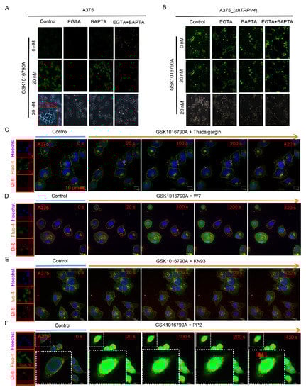 Blockade of Ca2+ signaling mediates exocytosis during activation of TRPV4 ion channel. (A) Cell images of A375 cells in GSK1016790A (20 nM) application with pretreatment by EGTA (0.5 mM) or BAPTA, AM (8 μM). (B) A375 cells in shTRPV4 upon agonist stimuli with blockade of either extracellular or intracellular calcium. (C) Time-lapse of scanning disk confocal images of A375 cells upon GSK1016790A (20 nM) stimuli with pretreatment with thapsigargin (50 nM). (D) Time-lapse of scanning disk confocal images of GSK1016790A (20 nM) application to A375 cells with pretreatment with W7 (10 μM), a calmodulin antagonist. Scale bar, 10 μm. (E) Time-lapse of scanning disk confocal images of GSK1016790A (20 nM) application to A375 cells with pretreatment with KN93 (1 μM), a selective inhibitor of Ca2+/calmodulin-dependent kinase II. Scale bar, 10 μm. (F) Scanning disk confocal images for time-lapse in A375 cells upon GSK1016790A (20 nM) addition with pretreatment of PP2 (10 μM), an effective inhibitor of tyrosine kinases. Scale bar, 10 μm.