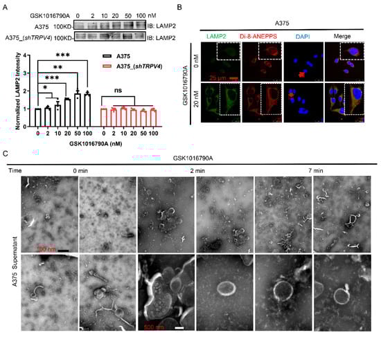 Lysosome-associated protein involves in TRPV4 mediated cell exocytosis. (A) Western blot of cell lysates probed for LAMP2 upon GSK1016790A (20 nM) in A375 cell as well as shTRPV4 A375 cells. Target protein quantification was normalized to total protein. (B) Confocal microscopy images of A375 cells immunostained for LAMP2. Scale bar, 25 μm. (C) Transmission electron microscopic images of lysosomes in cell supernatant upon GSK1016790A (20 nM) application. Scale bar as indicated in figure. Data are presented as mean ± SD of at least three independent experiments, t-test, * p < 0.05, ** p < 0.01, *** p < 0.001, ns indicates no significance.
