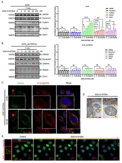 The folding & vesicle trafficking proteins aid in exocytosis. (A) Western blot of A375 cell (upon GSK1016790A by concentration gradient) lysates probed for the vesicle trafficking proteins of HSP90, dynamin1, clathrin (heavy chain), Rab3A, and EEA1, respectively. Target protein quantification was normalized to total protein. (B) Western blot of A375 cell with shTRPV4 (upon GSK1016790A by concentration gradient) lysates probed for the vesicle trafficking proteins of HSP90, dynamin1, clathrin (heavy chain), Rab3A, and EEA1, respectively. Target protein quantification was normalized to total protein. (C) Confocal spanning disk microscopic images of A375 cells with or without GSK1016790A (20 nM) addition immunostained for clathrin (heavy chain). Scale bar, 10 μm. (D) Transmission electron microscopic images of A375 cells upon GSK1016790A (20 nM) application. The arrowhead points to clathrin structure. Scale bar, 100 nm. (E) Time-lapse of scanning disk confocal images of A375 cells with clathrin (heavy chain) knock-down with GSK1016790A (20 nM) administration. Data are presented as mean ± SD of at least three independent experiments, t-test, * p < 0.05, ** p < 0.01, *** p < 0.001, ns indicates no significance.