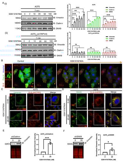 The interplay among vimentin/clathrin/SNX9 aids vesicles transduction of exocytosis. (A) Western blot of A375 and A375 with suppression of TRPV4 (upon GSK1016790A by concentration gradient) cell lysates probed for vimentin, clathrin (heavy chain), and SNX9, respectively. Target protein quantification was normalized to total protein. (B) Time-lapse of scanning disk confocal images of A375 cells with vimentin knock-down with GSK1016790A (20 nM) administration. Scale bar, 10 μm. (C) Confocal microscopic images of A375 cells treated with or without GSK1016790A (20 nM) immunostained for vimentin. Scale bar, 25 μm. (D) Confocal spanning disk microscopic images of A375 cells treated with or without GSK1016790A (20 nM) immunostained for SNX9. Scale bar, 10 μm. Western blot of A375 with (E) shclathrin and (F) shSNX9 (upon GSK1016790A (20 nM) stimuli) cell lysates probed for vimentin. Target protein quantification was normalized to total protein. Data are presented as mean ± SD of at least three independent experiments, t-test, * p < 0.05, ** p < 0.01, *** p < 0.001, ns indicates no significance.