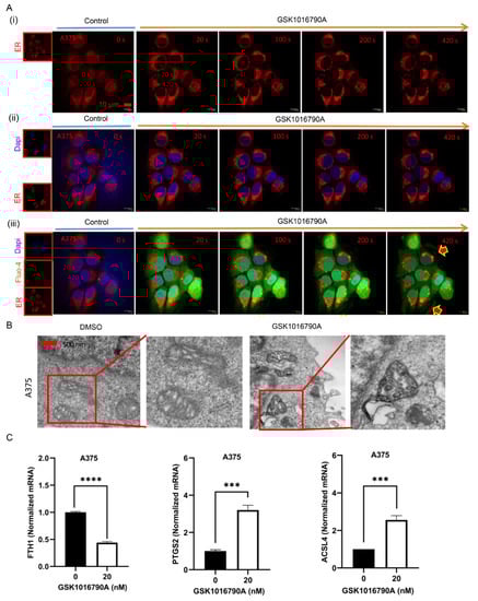 Agonism of TRPV4 induces vesicles priming from ER and subsequently ferroptosis of cells. (A) (i) & (ii) & (iii) Time-lapse of scanning disk confocal images of ER staining in A375 cells with GSK1016790A (20 nM) administration. Scale bar, 10 μm. (B) Transmission electron microscopic images of mitochondria in A375 cells incubated with GSK1016790A (20 nM) for 7 min. Scale bar, 500 nm. (C) Real-time PCR analysis of FTH1, PTGS2, and ACSL4 mRNA in A375 cells treated with GSK1016790A (20 nM). Data are presented as mean ± SD of at least three independent experiments, t-test, *** p < 0.001, **** p < 0.0001.