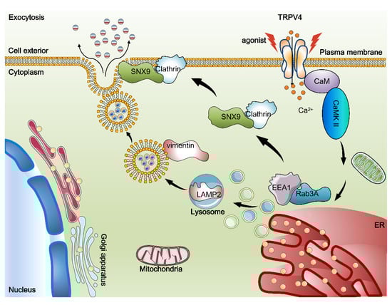 Here, we sought to investigate the role of TRPV4 in the process of exocytosis upon agonist stimulation in the A375 cell, which is a human melanoma cell line, as well as in several expression systems. We reasoned that if TRPV4 does actively modulate the exocytosis process in native cells, it might also do so in the heterologous expression system. We found that stimulation of native TRPV4 in A375 cells or transiently transfected TRPV4 in different cell lines indeed initiated prominent exocytosis. This cellular process requires TRPV4 as well as TRPV4-mediated calcium influx, lysosome associated protein, and several folding and vesicle trafficking proteins, all of which are key regulators of exocytosis. We also found that the ER primed vesicles upon agonist stimulation, whereas the subsequent mitochondrial crista reduction enabled calcium-dependent vesicular trafficking and induced cell ferroptosis. Our study identified a series of intracellular events following TRPV4 activation that facilitate exocytosis and revealed TRPV4 as a key functional link between exocytosis process and ferroptosis via calcium.