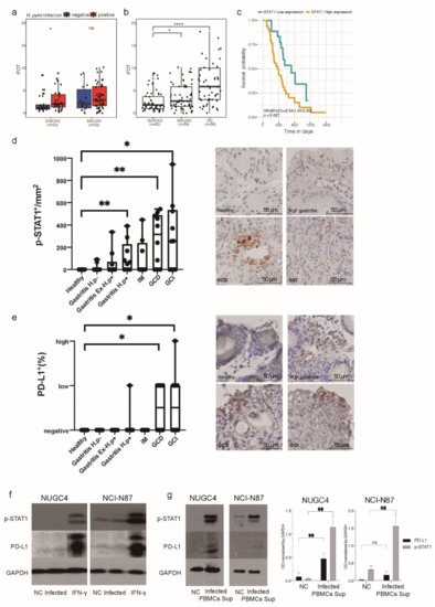 We next explored PD-L1 expression in the same tissue samples, as it was previously shown that STAT1 regulates its expression in other tumor types. PD-L1 was also significantly upregulated in GC compared to healthy mucosa (Figure 1e). These observations indicate that STAT1 activation may be an early response to H. pylori infection, while PD-L1 expression occurs only at later stages of progression to GC.