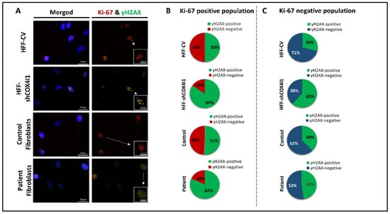 We previously showed that COX4-1-deficient cells display high levels of DSB relative to controls by performing phospho-histone H2AX Ser139 (γH2AX) foci staining [,]. We also noted that cells maintained in glucose-free restrictive medium (where cells with impaired OXPHOS cease to proliferate) lacked DSB []. We therefore set out to determine whether elevated DSB correlates with the proliferative status seen in COX4-1 deficiency, by co-staining with both γH2AX and Ki-67 (Figure 1). Although a positive co-staining of both markers was observed in many cells, COX4-1-deficient cells displayed a higher level of co-staining (Figure 1A) The pie charts (Figure 1B,C) represent the distribution of both proliferative (Ki-67-positive) and nonproliferative (Ki-67-negative) cell populations stained for DSBs (γH2AX-positive or -negative). We observed a statistically significant (p < 0.05) positive correlation between the fraction of proliferating Ki-67 HFF-shCOX4I1 and patient’s cells that were also γH2AX-positive (84% and 82%, respectively), while the proliferative fraction of control cells had a lower tendency (≈50% γH2AX-positive) (Figure 1B). As expected, the nonproliferative fraction disclosed a decreased occurrence of DSBs in all cells (Figure 1C). The difference between proliferative and nonproliferative γH2AX-positive cells was most marked (82% vs. 48%) in the patient’s cells. These results are consistent with replicative stress, as replicating cells disclose more nuclear DNA damage than nonreplicating cells.