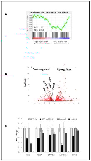 Our previous and present results show that COX4-1-deficient cells display high levels of DSB foci, which are correlated with their proliferative status. Thus, we hypothesized that the observed senescence is an attempt to ameliorate DNA damage due to replicative stress, possibly due to impaired DNA damage response (DDR) []. To explore this possibility, we re-evaluated the previously performed CEL-Seq2 analysis of HFF-shCOX4I, which showed the upregulation of the glycolytic and hypoxia-related pathways in accordance with our bioenergetic studies []. In the current study, we noticed a significant downregulated DNA repair pathway, which presented an enrichment of several genes linked to DNA repair (the top 20% downregulated genes are listed in Supplementary Material Table S1 and depicted in Figure 2A,B). We verified five of the downregulated genes present in the DNA repair enrichment gene set (XPC, PCNA, GMPR2, IMPDH2, UPF3) in COX4-1-deficient cells by RT-qPCR (Figure 2C). These genes are marked in the volcano plot, Figure 2B. We also detected a qualitative but not quantitative correlation between HFF-shCOX4I1 and the patient’s cells (Figure 2C). This could possibly be attributed to different nuclear backgrounds. Nevertheless, a decreased expression in all five genes quantified was observed, which was in agreement with the CEL-Seq2 analysis.