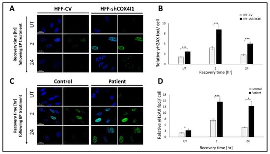 The present expression analysis, as well as our previous results showing increased sensitivity to PARP inhibitors [], led us to hypothesize that the nuclear DNA repair system and, specifically, homologous recombination (HR) is less effective in COX4-1 deficiency. To address this question, we examined the ability of COX4-1-deficient cells (both HFF-shCOX4I1 and the patient’s cells) to recover from an external DNA insult, i.e., their ability to repair DNA damage caused by a short exposure to a DNA-damaging chemical (etoposide; EP). To that end, we quantified γH2AX foci at two different time points, after an hour of exposure to EP. As shown in Figure 3, both HFF-shCOX4I1 (Figure 3A,C) and the patient’s cells (Figure 3B,D) displayed an impaired ability to respond and fully recover from a genotoxic insult, while the damage in the corresponding controls was almost fully-repaired after 24 h of recovery. However, exposure to EP treatment induced an initial increase in γH2AX foci after 2 h of “recovery”. After 24 h of recovery, both HFF-shCOX4I1 and the patient’s cells displayed a significant prolongation of the γH2AX foci signal, while both control cells had almost comparable levels relative to the untreated cells. This result indicates that the increased levels of DSB observed in COX4-1-deficient cells can most probably be attributed to an impaired DNA damage response.