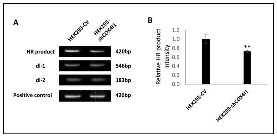In an attempt to further elucidate the mechanism, we specifically examined HR efficiency by employing a commercially available homologous recombination assay, which requires the co-transformation of cells with two plasmids encoding the LacZα gene but with two different mutations. Only a functioning HR is able to restore the intact gene. As transformation is much less efficient in primary cells such as HFF, we constitutively knocked-down COX4I1 in the HEK293 cell line (HEK293-shCOX4I1) instead. The knockdown efficiency and the presence of DSB were both validated in the HEK293 cells before commencing, and the results were comparable to those we reported in HFF-shCOX4I1 cells [] (Supplementary Material Figure S1). Subsequently, we co-transfected the mutant LacZα plasmids (dl-1 and dl-2) into both HEK293-shCOX4I1 and HEK293-CV overnight and analyzed the resulting products by PCR (Figure 4), detecting a 28% significant decrease in the HR efficiency compared to the control. Although the decrease was moderate, it was statistically significant and thus in accord with impaired DDR.