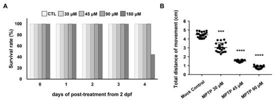 Effect of different concentrations of MPTP on the survival rate and swimming ability of zebrafish larvae. (A) The daily post-treatment survival rate of embryos immersed with different concentrations of MPTP, as indicated, starting at 2 dpf for 4 days. (B) Statistical analysis of the total swimming distance of larvae treated with different concentrations of MPTP as indicated. Larvae cultured in a 3 cm dish and treated with DMSO served as a mock control. The total distance (in cm) of a single larva was the sum of its swimming distance instigated by touches to the head and was averaged from three trials. The total distance of each experiment was the average total distance obtained from 20 larvae, while that of each group was averaged from three independent experiments. Student’s t-test was used to determine significant differences between each group (****, p < 0.0001; ***, p < 0.001).