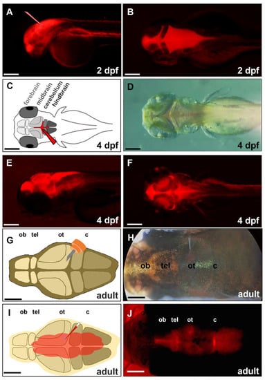- Kizil, C.; Brand, M. Cerebroventricular microinjection (CVMI) into adult zebrafish brain is an efficient misexpression method for forebrain ventricular cells. PLoS ONE 2011, 6, e27395. [Google Scholar] [CrossRef]