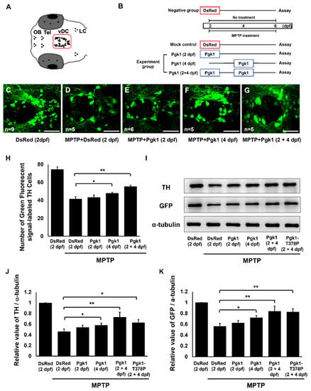 Zebrafish embryos at one day after fertilization (dpf) were incubated with Pronase (0.01 g/10 mL) for dechorionation. Then, embryos were immersed in water with 45 µM MPTP (Sigma-Aldrich, St. Louis, MO, USA, M0896) from 2 to 6 dpf, while the control group was immersed in water with DMSO from 2 to 6 dpf. Pgk1 (500 pg) was injected in a single shot into the brain of embryos either at 2 or 4 dpf. In a parallel experiment, Pgk1 was injected in a double shot into the brain, both at 2 and 4 dpf. When embryos developed into larvae at 6 dpf, the number of dopaminergic neurons located in vDC was calculated using immunostaining. Meanwhile, the swimming performance of 6-dpf larvae was also evaluated. After larvae were left to stand in a 3 cm dish for 1 min, mechanosensory stimulus was delivered to the head of each larva by touching it gently with the tip of a fishline. The route of movement was recorded by video, and swimming distance was quantified by ImageJ. The same protocol was subsequently repeated twice for each larva. The total swimming distance of each treated larva was obtained by adding the distance in cm from three mechanosensory stimuli. One datum of the total swimming distance of each trial was averaged from the total swimming distance from at least 20 treated larvae. The final data were averaged from three independent experiments and represented as mean ± S.D.