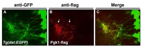 The catecholaminergic system in the CNS consists of catecholamine neurotransmitters, such as dopamine. Catecholaminergic neurons, including dopaminergic, adrenergic, and noradrenergic neurons, are involved in the secretion of neurotransmitters from the central and peripheral nervous systems, as well as hormones from the endocrine system []. The tyrosine hydroxylase (TH) uses tetrahydrobiopterin to convert tyrosine to l-DOPA. This is the initial step in the catecholamine biosynthetic pathway, and l-DOPA, the precursor to the neurotransmitters dopamine, norepinephrine (noradrenaline), and epinephrine (adrenaline), is expressed by all catecholaminergic neurons. In this case, when we observed differences in the degree of TH expression between the MPTP-treated group and the Pgk1-injected, MPTP-treated group, TH expression between these groups was not so obvious. In contrast, the dopamine transporter (DAT) is exclusively expressed in dopaminergic neurons in vertebrates []. When we employed the transgenic zebrafish Tg(dat:EGFP) [], the GFP signal was tagged only by dopaminergic neurons, we could observe that the differences in the degree of GFP expression between the MPTP-treated group and the Pgk1-injected, MPTP-treated group were relatively obvious. To clarify, not all TH-expressing cells were damaged by MPTP; thus, the degree of TH expression would, correspondingly, be less noticeable. However, since only dopaminergic neurons were labeled by GFP in the Tg(dat:EGFP) embryos, differences in the degree of GFP expression was more detectable based on the all-or-none law in physiology. Therefore, we believe that this standard is sufficient and that it allows sufficient latitude by which to detect the amount of GFP expressed in Tg(dat:EGFP) embryos, hence the number of dopamine neurons damaged by MPTP, as reported by Kalyn and Ekker [].