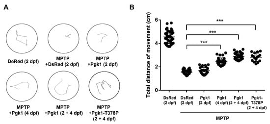 Injection of recombinant Pgk1-Flag into the brain could partially rescue the impairment of swimming performance of MPTP-induced zebrafish larvae. Six groups of zebrafish larvae at 6 dpf, as indicated, were categorized: (1) DsRed (2dpf): embryos at 2 dpf were injected with DsRed protein without MPTP treatment and served as a negative control; (2) MPTP + DsRed (2dpf): embryos at 2 dpf were injected with DsRed protein and treated with MPTP as a mock control; (3–5) Experimental groups: (3) MPTP + Pgk1 (2 dpf): embryos at 2 dpf were injected with Pgk1 and treated with MPTP from 2 to 6 dpf; (4) MPTP + Pgk1 (4 dpf): embryos at 4 dpf were injected with Pgk1 and treated with MPTP from 2 to 6 dpf; and (5) MPTP + Pgk1 (2 + 4 dpf): embryos at 2 and 4 dpf were individually injected with Pgk1 and treated with MPTP from 2 to 6 dpf; and (6) MPTP + Pgk1-T378P (2 + 4 dpf): embryos at 2 and 4 dpf were individually injected with mutated Pgk1-T378P and treated with MPTP from 2 to 6 dpf. The swimming route of each zebrafish larva at 6 dpf was tracked using ImageJ software, and its swimming distance was calculated in cm. (A) The three times head touch-evoked swimming routes of a single larva in six groups of zebrafish larvae were recorded. (B) Statistical analysis of the total swimming distance (in cm) per larva in each group. The total distance of a single larva was the sum of swimming distance instigated by touches to the head and averaged from three trials. The total distance of each experiment was the average total distance obtained from 20 to 35 larvae, while that of each group was averaged from three independent experiments. Student’s t-test was used to determine significant differences between each group (***, p < 0.001).