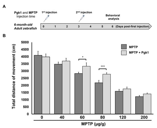 Direct injection of Pgk1 into the brain of adult zebrafish alleviates the impairment of swimming performance induced by MPTP. (A) Schematic diagram to illustrate the timetable of the six-month-old adult zebrafish being treated with intraperitoneal injections of MPTP, combined with a brain injection of Pgk1, followed by behavioral analysis. (B) Statistical analysis of total swimming distance (in cm) of adult fish treated with different concentrations of MPTP, as indicated, combined with, or without, a Pgk1 injection. The total swimming distance was averaged from three independent trials, and the distance of each trial was averaged from five adult fish, while the distance of a single fish sample was averaged from three touches. Student’s t-test was used to determine significant differences between each group (***, p < 0.001; *, p < 0.05).