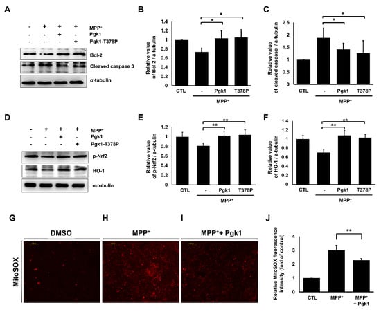 Extracellular addition of Pgk1 suppresses MPP+-induced apoptosis and mitochondrial ROS levels in SH-SY5Y cells. (A,D) Western blot analysis. The expression levels of Bcl-2, cleaved caspase-3, and p-Nrf2 and HO-1 proteins, as indicated, of SH-SY5Y cells treated or not treated with 0.5 mM MPP+ in the absence or presence of Pgk1 or kinase-deficient mutant T378P Pgk1 for 24 h. The α-tubulin served as an internal control of loading protein. (B,C,E,F) Statistical analysis of relative value of target protein expressed in cells with different treatment after normalization of the expression level of α-tubulin. (G–I) The microscopic images of MitoSOX red fluorescence signal shown on cells. SH-SY5Y cells treated with or without 0.5 mM MPP+ in the absence or presence of Pgk1 and then stained with MitoSOX to detect the level of ROS generated in cells. (J) Quantification of intensity of fold increase of MitoSOX red fluorescence signal compared to that of cells without treatment served as a control group (CTL), which was set as 1. All data were averaged from three independent experiments and represented as mean ± S.D. Student’s t-test was used to determine significant differences between each group (**, p < 0.01; *, p < 0.05).