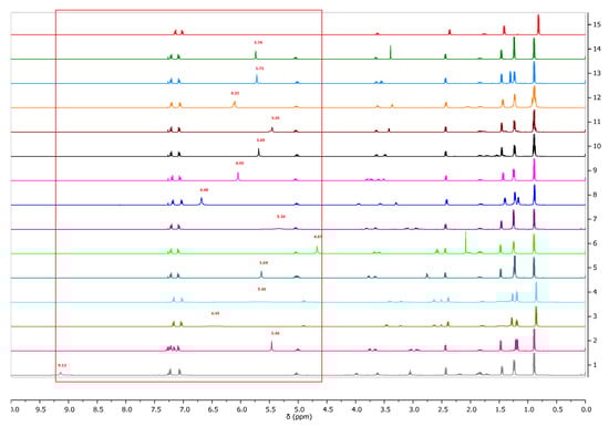 1H NMR spectra for ibuprofen and ibuprofen salts, from the top: IBU (red—15), [GlyOiPr][IBU] (green—14), [L-AlaOiPr][IBU] (blue—13), [L-ValOiPr][IBU] (orange—12), [L-IleOiPr][IBU] (maroon—11), [L-LeuOiPr][IBU] (black—10), [L-SerOiPr][IBU] (purplish red—9), [L-ThrOiPr][IBU] (dark blue—8), [L-CysOiPr][IBU] (purple—7), [L-MetOiPr][IBU] (yellow-green—6), [L-Asp(OiPr)2][IBU] (cyan-green—5), [L-LysOiPr][IBU] (cyan—4), [L-LysOiPr][IBU]2 (yellowish-green—3) [L-PheOiPr][IBU] (pink—2), [L-ProOiPr][IBU] (gray—1) (the amino and protonated amino group are marked in the red square).