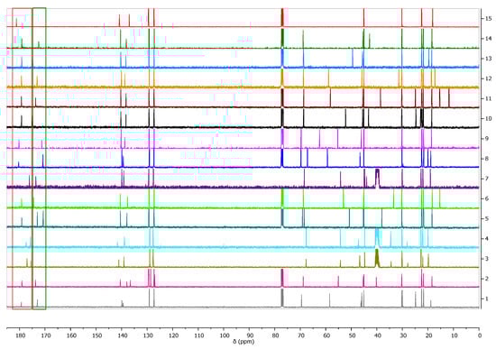13C NMR spectra for ibuprofen and ibuprofen salts, from the top: IBU (red—15), [GlyOiPr][IBU] (green—14), [L-AlaOiPr][IBU] (blue—13), [L-ValOiPr][IBU] (orange—12), [L-IleOiPr][IBU] (maroon—11), [L-LeuOiPr][IBU] (black—10), [L-SerOiPr][IBU] (purplish red—9), [L-ThrOiPr][IBU] (dark blue—8), [L-CysOiPr][IBU] (purple—7), [L-MetOiPr][IBU] (yellow-green—6), [L-Asp(OiPr)2][IBU] (cyan-green—5), [L-LysOiPr][IBU] (cyan—4), [L-LysOiPr][IBU]2 (yellowish-green—3) [L-PheOiPr][IBU] (pink—2), [L-ProOiPr][IBU] (gray—1) (carbonyl carbons from ibuprofen anions are marked in red square, and carbonyl carbons from amino acid isopropyl esters are marked in green square).
