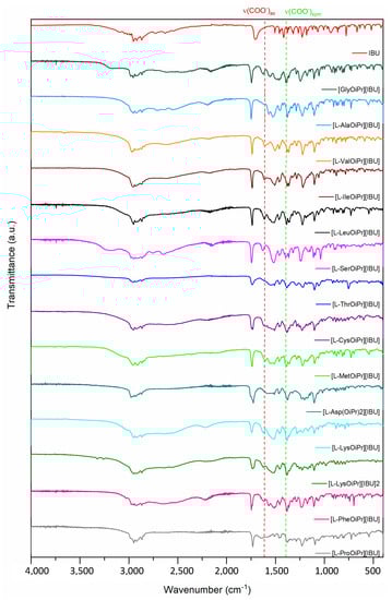 ATR-FTIR for ibuprofen and ibuprofen salts, from the top: IBU (red), [GlyOiPr][IBU] (green), [L-AlaOiPr][IBU] (blue), [L-ValOiPr][IBU] (orange), [L-IleOiPr][IBU] (maroon), [L-LeuOiPr][IBU] (black), [L-SerOiPr][IBU] (purplish red), [L-ThrOiPr][IBU] (dark blue), [L-CysOiPr][IBU] (purple), [L-MetOiPr][IBU] (yellow-green), [L-Asp(OiPr)2][IBU] (cyan-green), [L-LysOiPr][IBU] (cyan), [L-LysOiPr][IBU]2 (yellowish-green) [L-PheOiPr][IBU] (pink), [L-ProOiPr][IBU] (gray); (νsym.) (COO−), and asymmetric (νasym.) (COO−) stretching vibrations marked in green and red, respectively).