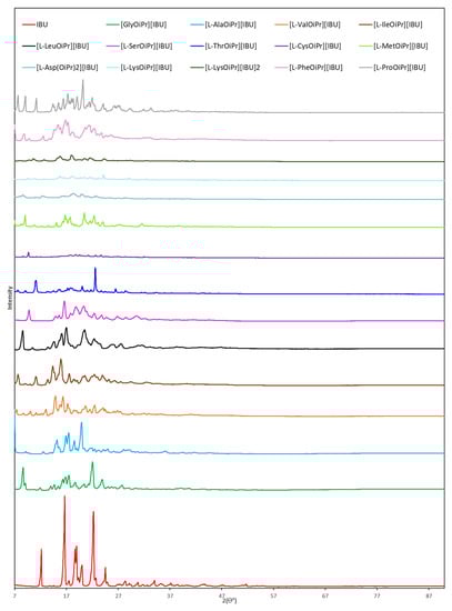X-ray diffraction patterns of ibuprofen and ibuprofen salts, from the top: IBU (red), [GlyOiPr][IBU] (green), [L-AlaOiPr][IBU] (blue), [L-ValOiPr][IBU] (orange), [L-IleOiPr][IBU] (maroon), [L-LeuOiPr][IBU] (black), [L-SerOiPr][IBU] (purplish red), [L-ThrOiPr][IBU] (dark blue), [L-CysOiPr][IBU] (purple), [L-MetOiPr][IBU] (yellow-green), [L-Asp(OiPr)2][IBU] (cyan-green), [L-LysOiPr][IBU] (cyan), [L-LysOiPr][IBU]2 (yellowish-green) [L-PheOiPr][IBU] (pink), [L-ProOiPr][IBU] (gray).