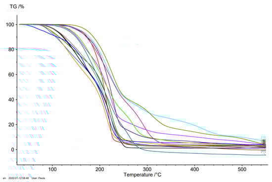 The TG curves of ibuprofen and ibuprofen salts, from the top: IBU (red), [GlyOiPr][IBU] (green), [L-AlaOiPr][IBU] (blue), [L-ValOiPr][IBU] (orange), [L-IleOiPr][IBU] (maroon), [L-LeuOiPr][IBU] (black), [L-SerOiPr][IBU] (purplish red), [L-ThrOiPr][IBU] (dark blue), [L-CysOiPr][IBU] (purple), [L-MetOiPr][IBU] (yellow-green), [L-Asp(OiPr)2][IBU] (cyan-green), [L-LysOiPr][IBU] (cyan), [L-LysOiPr][IBU]2 (yellowish-green) [L-PheOiPr][IBU] (pink), [L-ProOiPr][IBU] (gray).