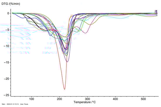 The DTG curves of ibuprofen and ibuprofen salts, from the top: IBU (red), [GlyOiPr][IBU] (green), [L-AlaOiPr][IBU] (blue), [L-ValOiPr][IBU] (orange), [L-IleOiPr][IBU] (maroon), [L-LeuOiPr][IBU] (black), [L-SerOiPr][IBU] (purplish red), [L-ThrOiPr][IBU] (dark blue), [L-CysOiPr][IBU] (purple), [L-MetOiPr][IBU] (yellow-green), [L-Asp(OiPr)2][IBU] (cyan-green), [L-LysOiPr][IBU] (cyan), [L-LysOiPr][IBU]2 (yellowish-green) [L-PheOiPr][IBU] (pink), [L-ProOiPr][IBU] (gray).
